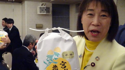 抽選会の景品を手にして。秋田の銘品を皆さんも次回にどうぞ