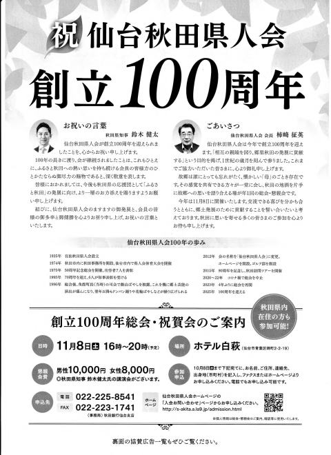 11月8日 ホテル白萩で仙台秋田県人会創立100周年総会・祝賀会を開催しました